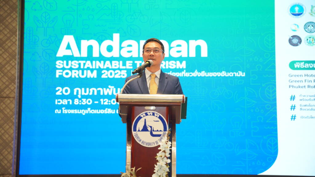 วันนี้ (20 ก.พ.) ที่โรงแรมภูเก็ตเมอร์ลิน มูลนิธิพัฒนาการท่องเที่ยวยั่งยืน โดยการสนับสนุนจากการท่องเที่ยวแห่งประเทศไทย (ททท.) จัดงาน Andaman Sustainable Tourism Forum 2025 โดยมี นายโสภณ สุวรรณรัตน์ ผู้ว่าราชการจังหวัดภูเก็ต กล่าวต้อนรับ และนายภูมิกิตติ์ รักแต่งาม ประธานมูลนิธิพัฒนาการท่องเที่ยวยั่งยืน กล่าวรายงาน พร้อมทั้งมีการบรรยายพิเศษเรื่อง “Thailand Tourism Green Plan” โดย น.ส.วรธีรา สุวรรณศร ผู้อำนวยการกองพัฒนาบริการท่องเที่ยว กรมการท่องเที่ยว กระทรวงการท่องเที่ยวและกีฬา และพิธีการเปิดสัมมนาและปาฐกถาพิเศษเรื่อง “ปักหมุดการท่องเที่ยวไทยสู่ความยั่งยืน” โดยนายนราพัฒน์ แก้วทอง ผู้ช่วยรัฐมนตรีว่าการกระทรวงทรัพยากรธรรมชาติและสิ่งแวดล้อม