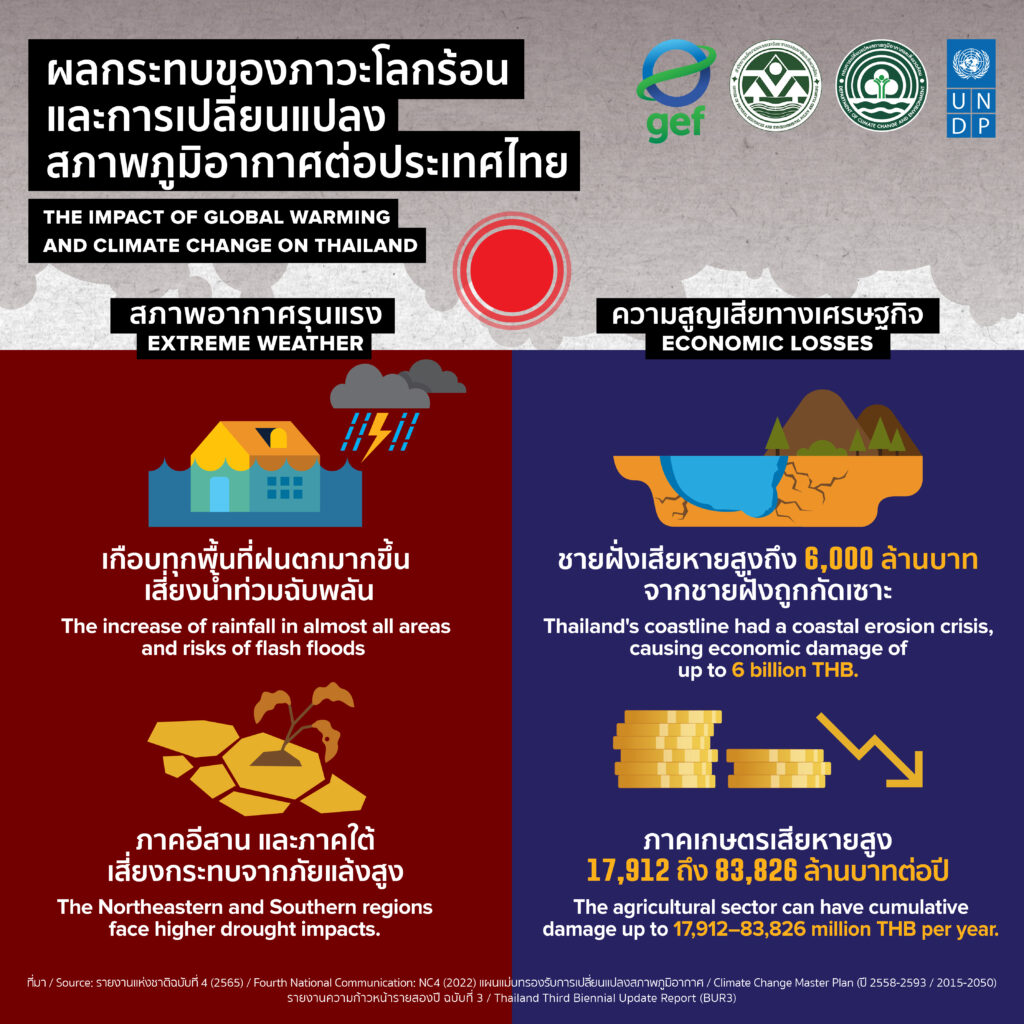 - ด้านผลกระทบต่อเศรษฐกิจ ในช่วงไม่กี่ปีที่ผ่านมา 23% ของพื้นที่ชายฝั่งเผชิญวิกฤตการถูกกัดเซาะและสูญเสียพื้นที่จากการถูกกัดเซาะ 1-5 เมตรต่อปี ก่อให้เกิดความสูญเสียทางเศรษฐกิจสูงถึง 6,000 ล้านบาท ในด้านเกษตรกรรม โลกร้อนกระทบการเพาะปลูกโดยตรงเพราะความร้อนและปริมาณน้ำฝนที่ผันผวนทำให้ดินในการเพาะปลูกพืชสมบูรณ์น้อยลง และน้ำไม่เพียงพอต่อการทำเกษตรกรรม ส่งผลให้ผลผลิตทางการเกษตรเสียหาย เช่น มันสำปะหลังเน่าเสียจากปริมาณน้ำฝนที่มากเกินไป อ้อยขาดน้ำจากหน้าแล้งยาวนานขึ้น นอกจากนี้ปศุสัตว์เองก็ได้รับผลกระทบต่อสุขภาพ การเติบโต และการเพาะพันธุ์ เช่น อากาศร้อนทำให้หมูเครียด และเจริญพันธุ์น้อยลง โดยระหว่างปี พ.ศ. 2554-2588 ผลกระทบสะสมต่อภาคเกษตรสามารถสร้างความเสียหายรวมเป็นมูลค่ารวมสูง 17,912 ถึง 83,826 ล้านบาทต่อปี